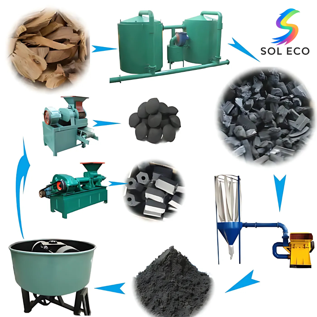 The production process of sawdust charcoal briquettes from start to finish, showcasing modern and sustainable technology